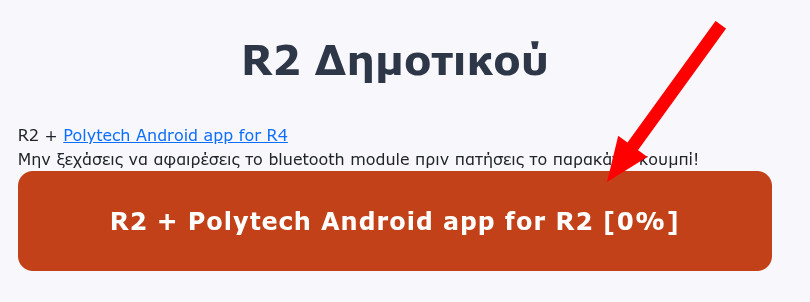 Αυτό πλέον είναι μη απαραίτητο. Ας πάρουμε το Παράδειγμα 0: Αρκεί η σύνδεση του R2 σε μια θύρα USB, το άνοιγμα του Google Chrome (ή κάποιου πρώτο ξαδέρφου του όπως Chromium, Brave, Edge κλπ) και η επίσκεψη στη σελίδα του έργου [εδώ]. Scroll προς τα κάτω και κλικ στο κουμπί R2 + Polytech Android app for R2 (δες την παρακάτω εικόνα).